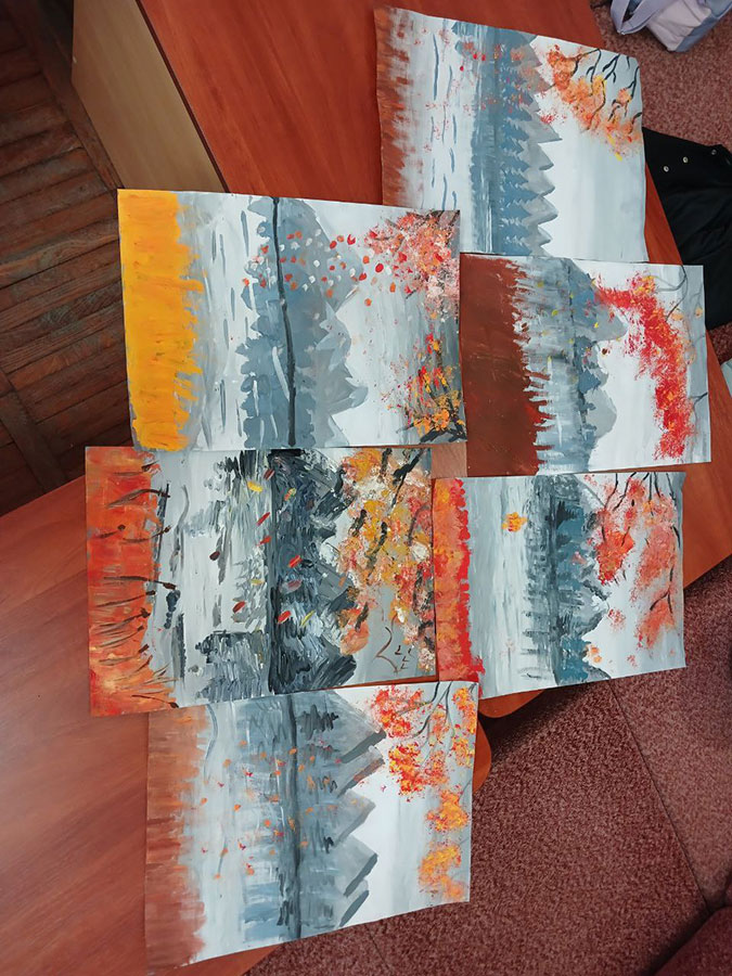 Спершу юні художники створили осінній пейзаж - з багряними кронами дерев, золотими алеями, м’яким небом і ніжним світлом. Кожна робота стала своєрідною історією - шелесту листя, подиху вітру.