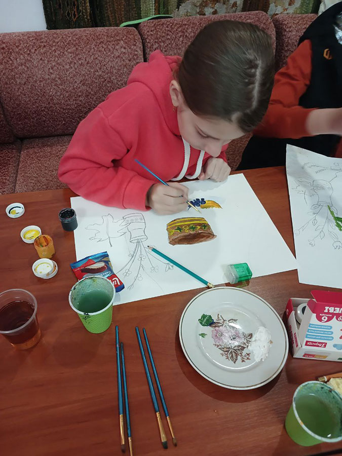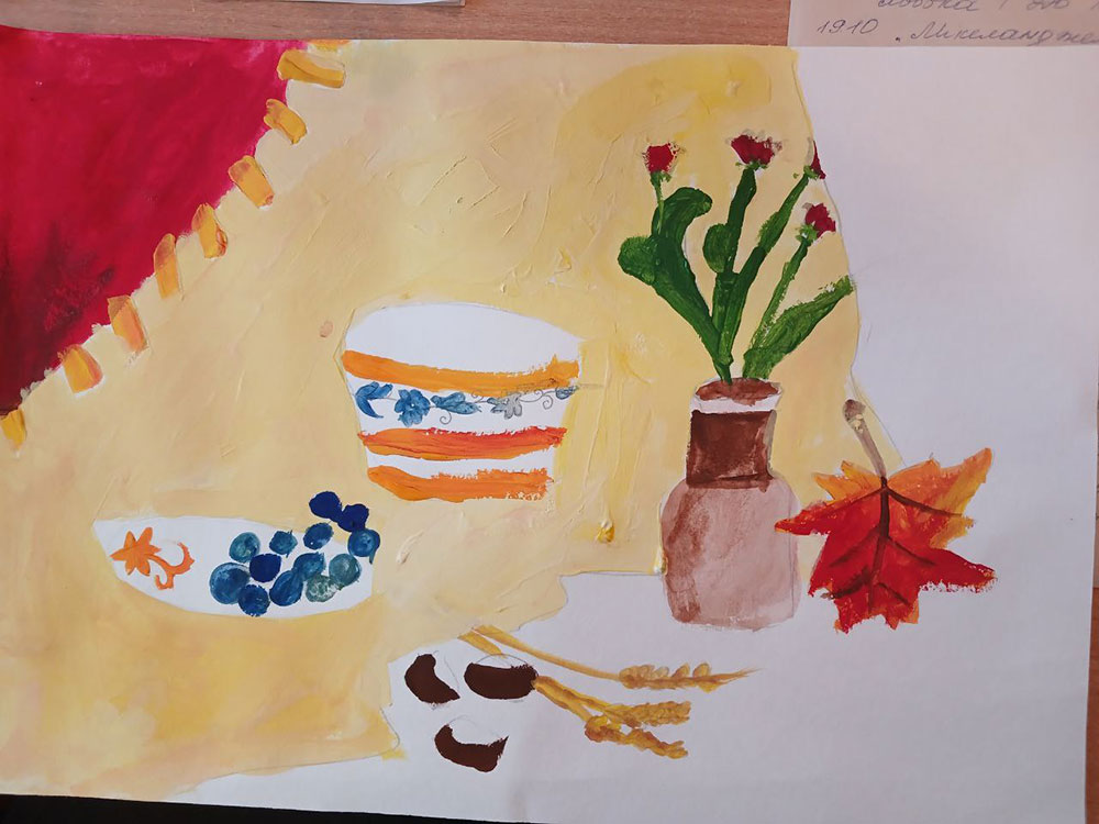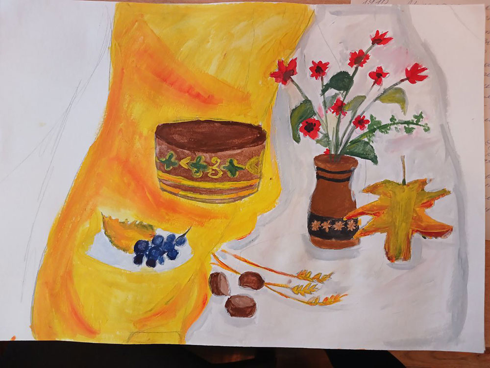Наступне заняття студії було присвячене осінньому натюрморту. Це вже інший, глибший погляд на красу пори року - уважне спостереження, відчуття гармонії форми та кольору. На аркушах з’явилися виноград, глечик, калинові грона, гілочки барвистого листя. Кожна деталь — продумана, наповнена світлом і відчуттям домашнього затишку.