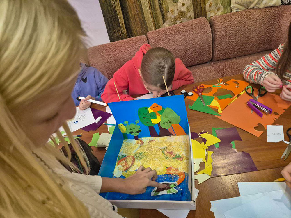 Потім школярики разом створювали спільний Острів Спокою. Кожен додавав до нього щось своє ‒ пісок, папір, крупинки світла. Ця спільна робота допомагала відчути, що у кожного є місце, де безпечно, де можна відпочити й бути собою. На ньому з’явилися дерева ‒кожна дитина вирізала своє й підписала ім’ям. Вони нагадували про силу та внутрішню впевненість. Разом дерева утворили Ліс спокою ‒ маленький світ, де можна знаходити підтримку й радість поруч із друзями.