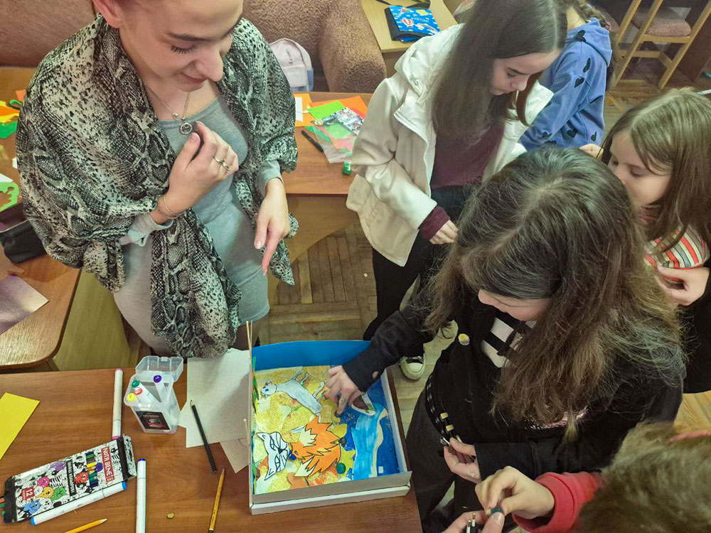 Навколо острова учні розклали камінці й мушлі ‒ маленькі охоронці простору, що допомагають берегти спокій. А на самому острові оселилися тваринки-захисники ‒ вигадані істоти, які дарують відчуття безпеки й упевненості. Хтось створив спокійного кита, хтось ‒ мудру і сміливу собаку, а хтось ‒ сильну пантеру. Через ці образи діти відчували власну силу, турботу й спокій.