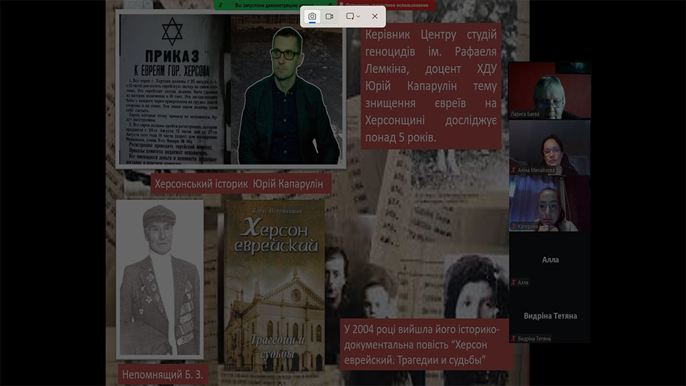 Наприкінці зустрічі присутні дізналися, де можуть більш детально ознайомитися з темою Голокосту в Херсоні. Зокрема, це наукові праці керівника Центру студій геноцидів ім. Рафаеля Лемкіна, доцента ХДУ Юрія Капаруліна, а також книга Бориса Непомнящего «Херсон єврейський».