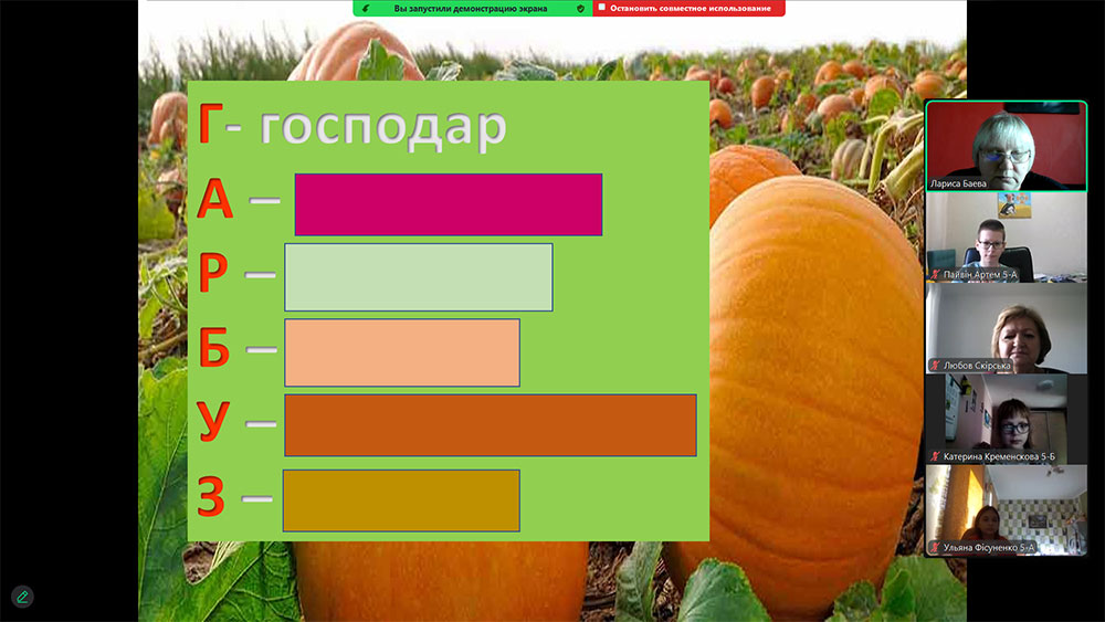 - у грі «Гарбузові асоціації» діти на кожну літеру слова «гарбуз» підбирали цікаві характеристики цього овоча;