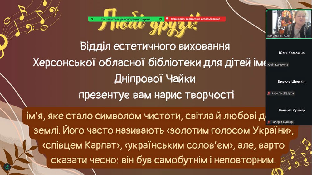 У відділі естетичного виховання Херсонської обласної бібліотеки для дітей імені Дніпрової Чайки для старшокласників Херсонського загальноосвітнього навчально-виховного комплексу № 11 відбувся захід - нарис творчості «Назарій Яремчук: Місія, призначена небом», присвячений легенді української естради, чия творчість стала важливою сторінкою в історії української музики та справжнім голосом цілого покоління.