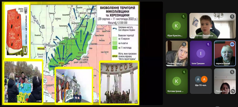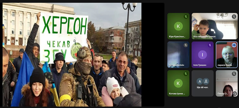 Протягом зустрічі школярі пригадали події окупації Херсона, перші мітинги херсонців проти загарбників, невимовну сміливість і силу духу місцевих жителів, які попри численні загрози щодня доводили: Херсон – це Україна. Особливу увагу присутні звернули на історії людей, які залишалися в місті, жили в умовах постійного тиску, але не втратили віри у визволення.