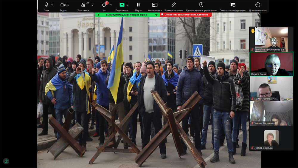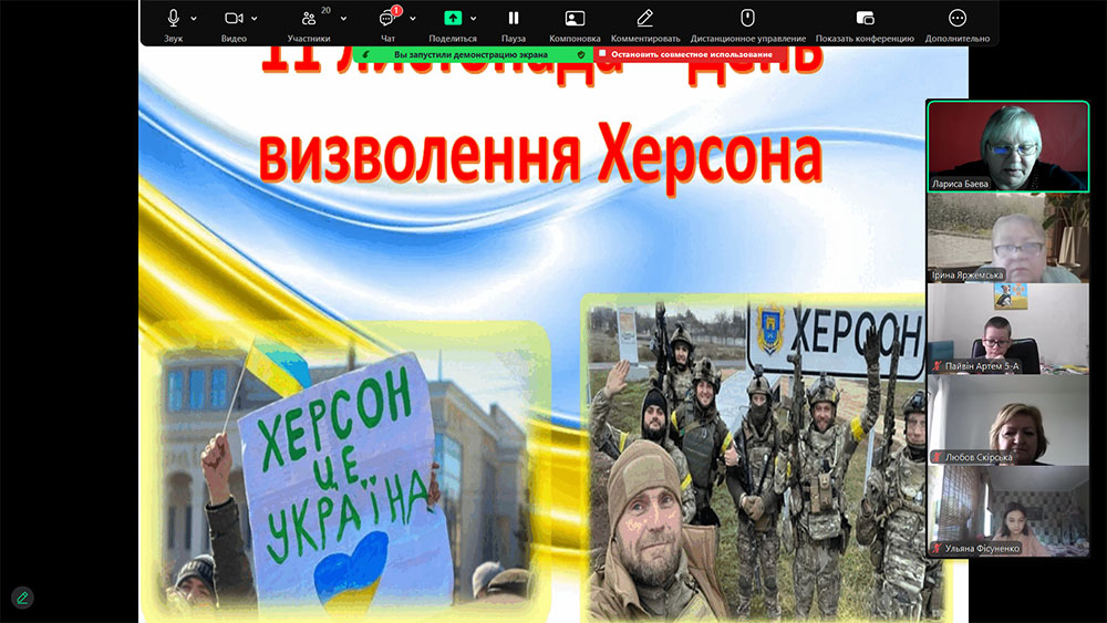 Розповідь бібліотекара супроводжувалася документальними відеокадрами тих подій, що допомогло учням глибше відчути атмосферу пережитого: акції протесту, українські прапори в руках містян, які не злякалися окупантів, і, звісно, радість дня визволення — 11 листопада 2022 року, коли Херсон знову повернувся додому.