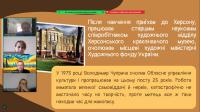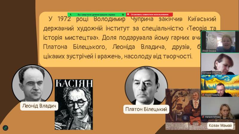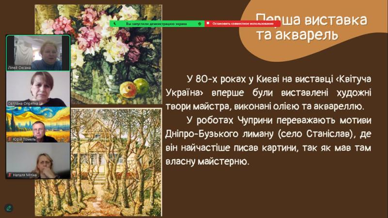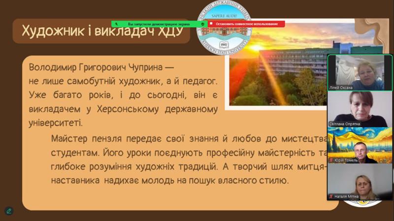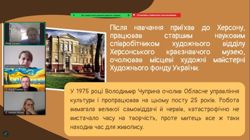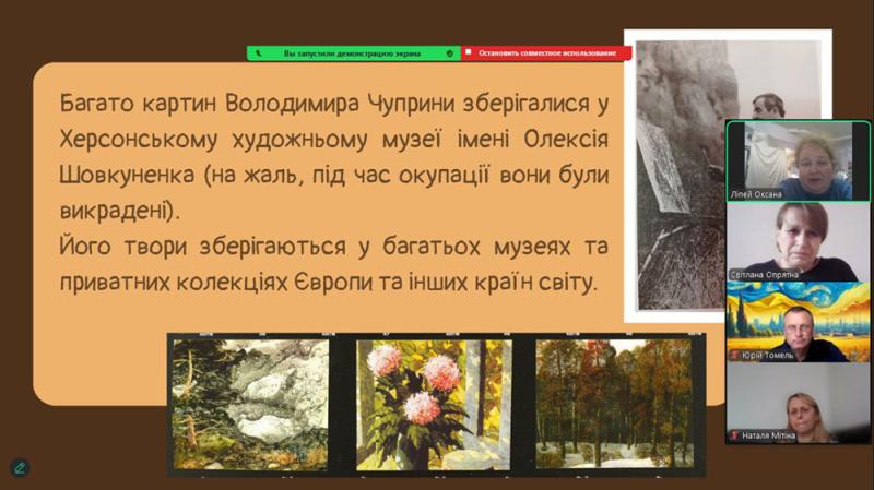 Фахівці відділу естетичного виховання Херсонської обласної бібліотеки для дітей імені Дніпрової Чайки провели для старшокласників Херсонського загальноосвітнього навчально-виховного комплексу №48 Херсонської міської ради мистецький етюд «Палітра, народжена з південного сонця». Захід присвячено 85-річчю від дня народження Володимира Григоровича Чуприни - народного художника України, мистецтвознавця, заслуженого діяча мистецтв, людини, яка все своє життя присвятила служінню мистецтву й рідній Херсонщині.