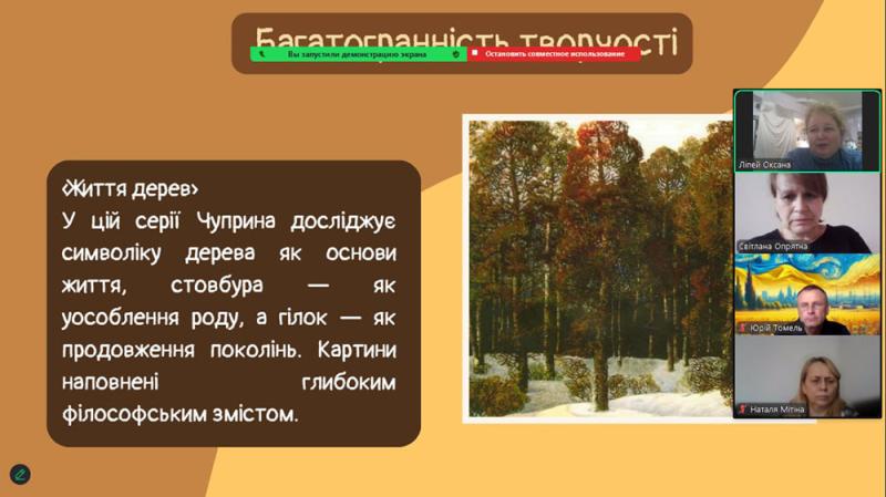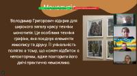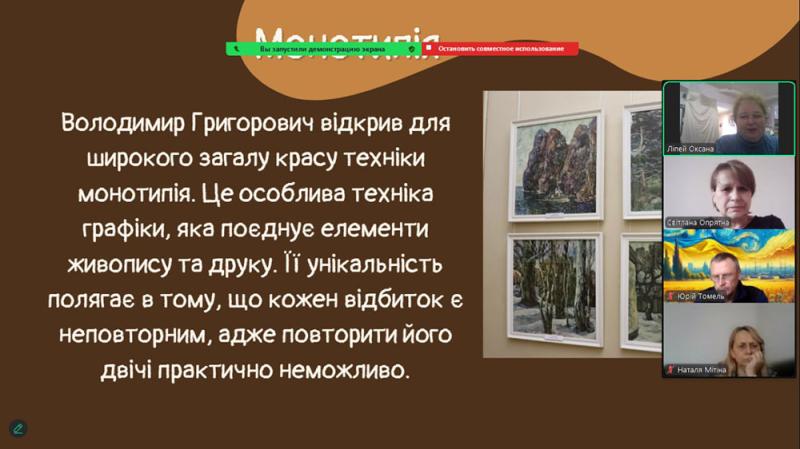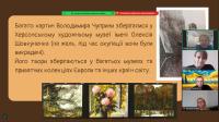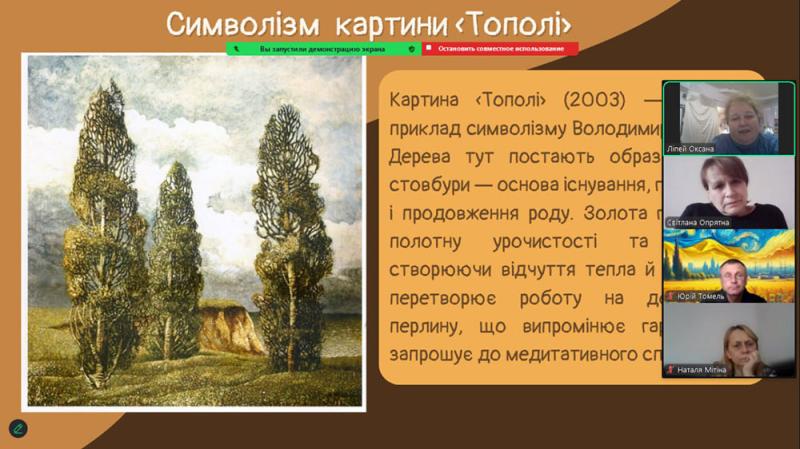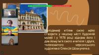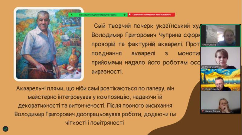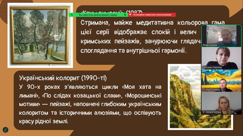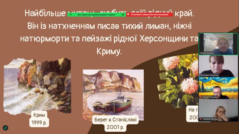 Школярі переглянули слайд-презентацію, де ожили найвідоміші полотна художника - краєвиди Херсонщини, Криму, Львівщини, Болгарії, а особливо - квіти, якими він оспівував красу рідної землі. Ліричність і поетичність робіт митця справили глибоке враження на учнів, а його любов до природи й рідного краю спонукала до пошуку свого шляху у творчості.