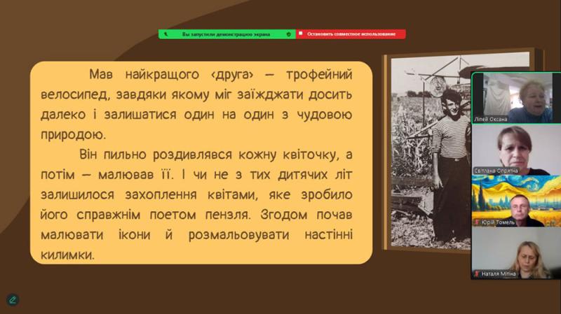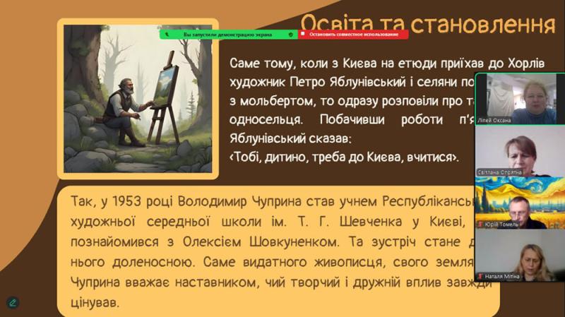 Учні дізналися про дитинство митця у мальовничих Хорлах, про перші малюнки, народжені з любові до природи, і про ту щасливу зустріч із художником Петром Яблунівським, що відкрила юному Володі шлях до великого мистецтва.