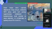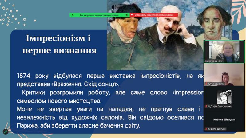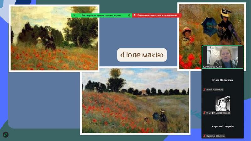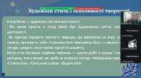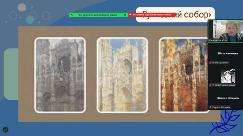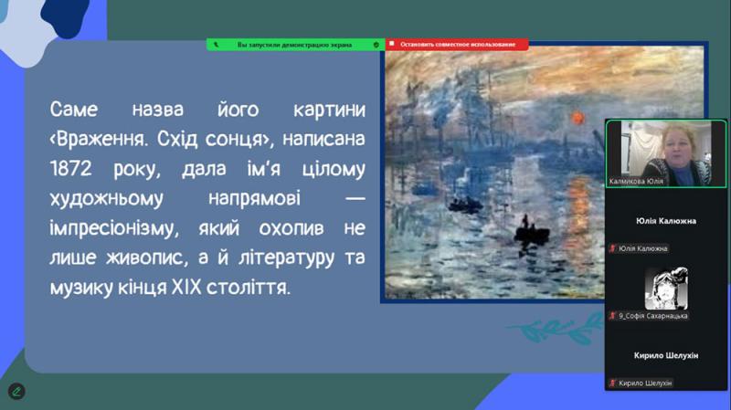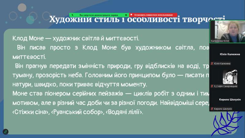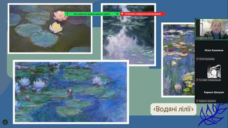 Серії пейзажів Моне - «Стіжки сіна», «Руанський собор», «Водяні лілії» - викликали щире захоплення. Вони розкрили головну ідею митця: показати, як світ постійно змінюється під впливом часу, світла та погоди. Старшокласники з інтересом переглянули уривки відеоматеріалів про виставку «Водяних лілій» у музеї Оранжері в Парижі та мультимедійні проєкти, присвячені творчості художника.
