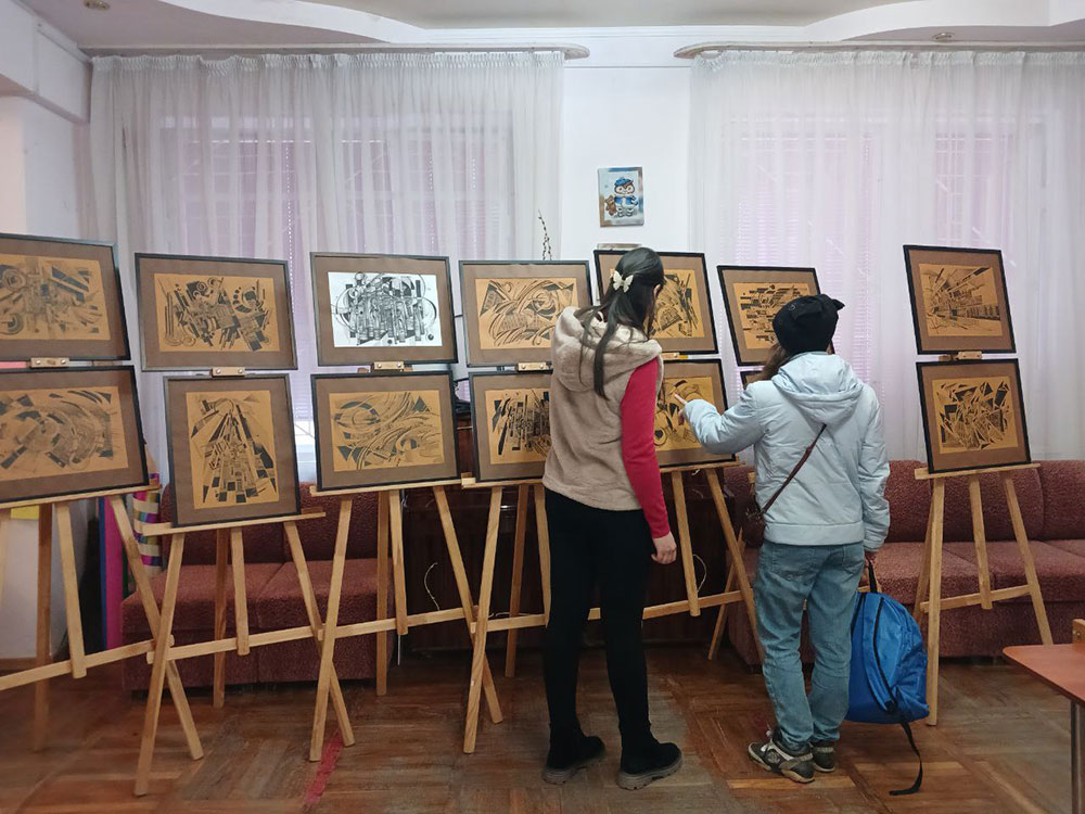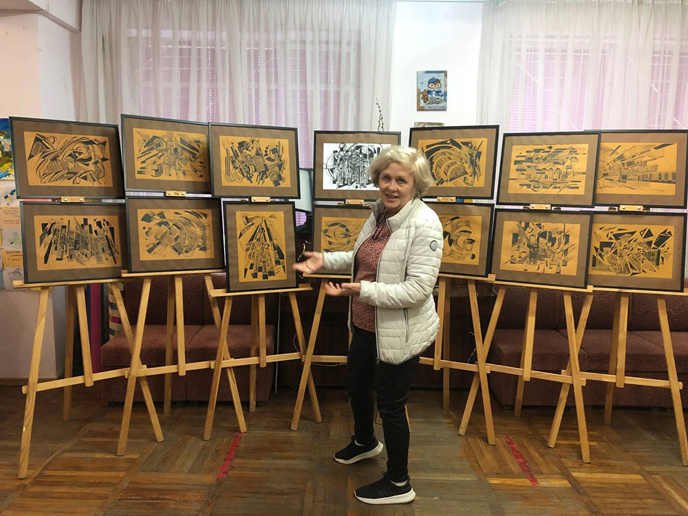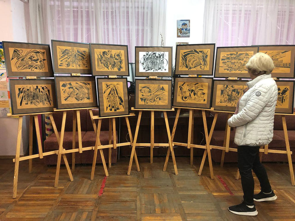 Після презентацій у Миколаєві та в укриттях Херсона, побачити роботи талановитої авторки тепер можуть і відвідувачі нашої бібліотеки. Експозиція налічує 14 графічних робіт, на яких зображено знакові архітектурні споруди та пам’ятки Херсона, що нині перебувають під загрозою знищення через постійні обстріли: Антонівський міст, будівлі музеїв, історичні фасади центральних кварталів, Морську академію, Катерининський собор та інші об’єкти, що стали мішенню війни.