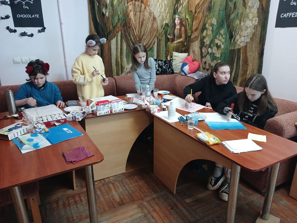 На першому етапі заняття діти працювали над зимовим пейзажом. Особливу увагу було приділено побудові композиції, передачі просторової глибини та перспективи, а також добору холодної кольорової гами з використанням теплих світлових акцентів. У процесі роботи учасники вчилися зображати характерні ознаки зимової природи – засніжені дерева, лісові масиви, дороги, водойми та гірські силуети, передаючи спокійний і врівноважений настрій зимового пейзажу.
