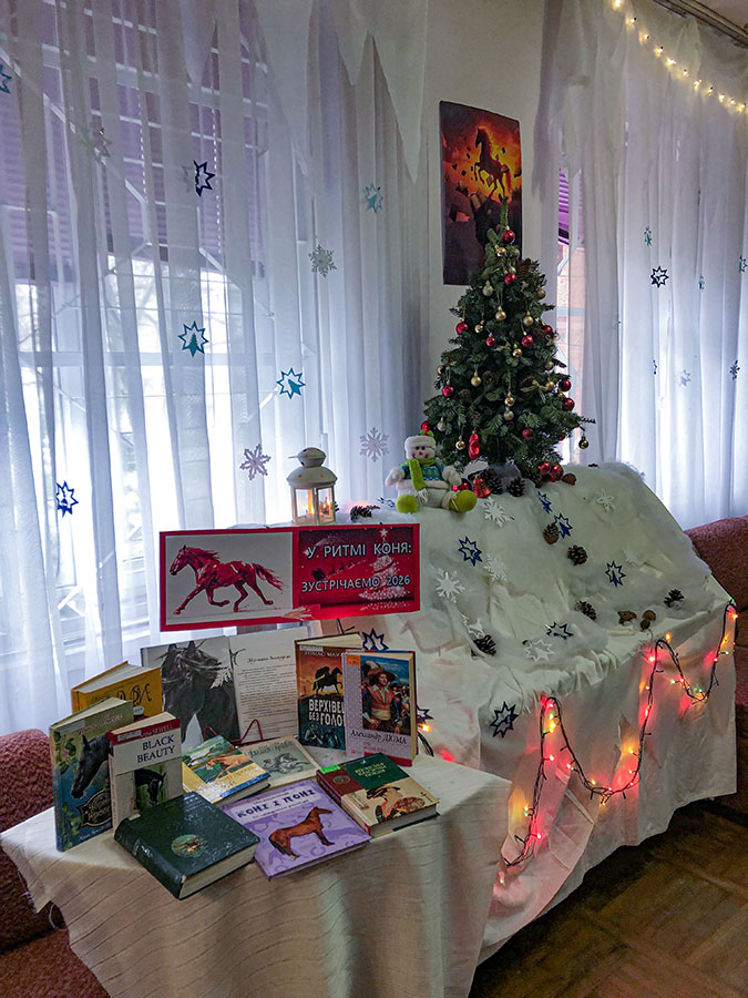 У книжково-новорічній інсталяції «У ритмі Коня: зустрічаємо 2026» представлено добірку художніх творів, у яких кінь уособлює шлях, вибір і право жити у власному темпі.