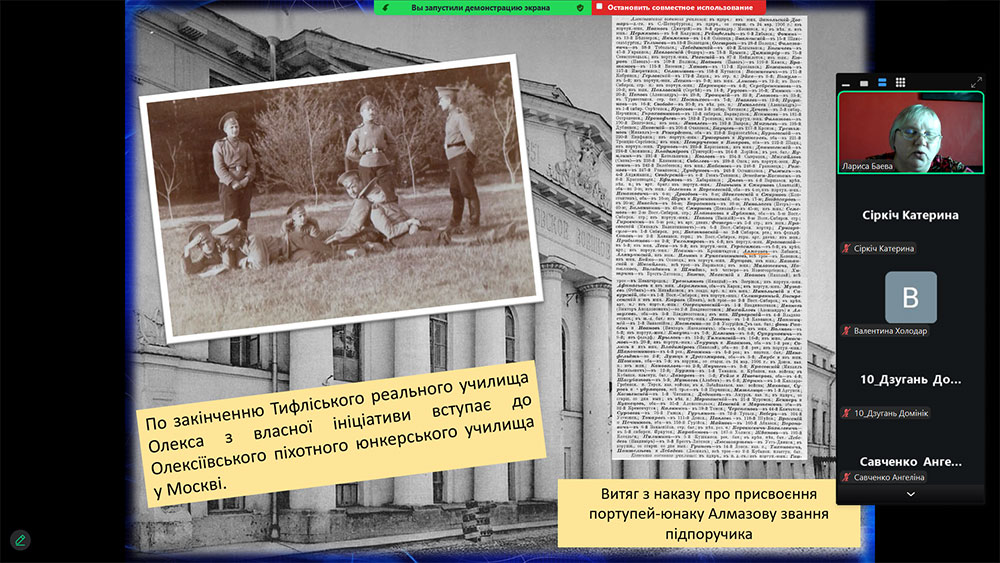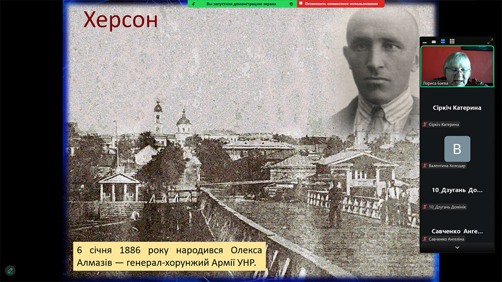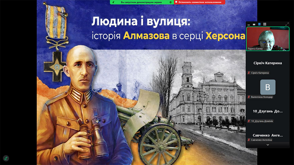 Під час зустрічі старшокласники дізналися про життя і діяльність Олекси Алмазова — військового діяча періоду Української революції, чиє дитинство минуло в Херсоні. Саме з нашим містом пов’язані перші роки його життя та формування світогляду майбутнього борця за українську державність.